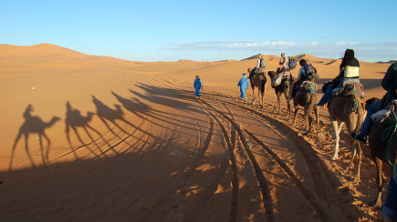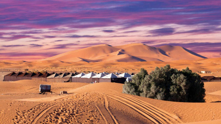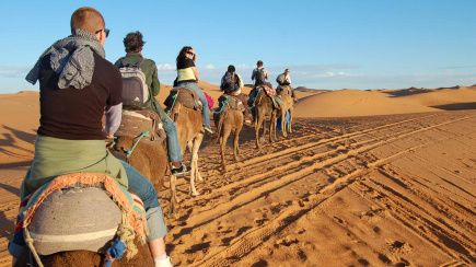 Het is een unieke ervaring om per dromedaris een tocht te maken door de prachtige gouden duinenpracht van de Sahara, waarna we vervolgens de zonsopgang kunnen meemaken in de woestijn. Diner en overnachting vinden plaats in goed verzorgde tenten. In het kamp zijn eenvoudige sanitaire voorzieningen (drie toiletten) aanwezig. Door de prachtige omgeving is dit een ervaring om nooit meer te vergeten. We kunnen zelfs slapen onder sterrenhemel. Het eerste gedeelte zal worden afgelegd per Land Rover om vervolgens per dromedaris de zandroute te vervolgen.